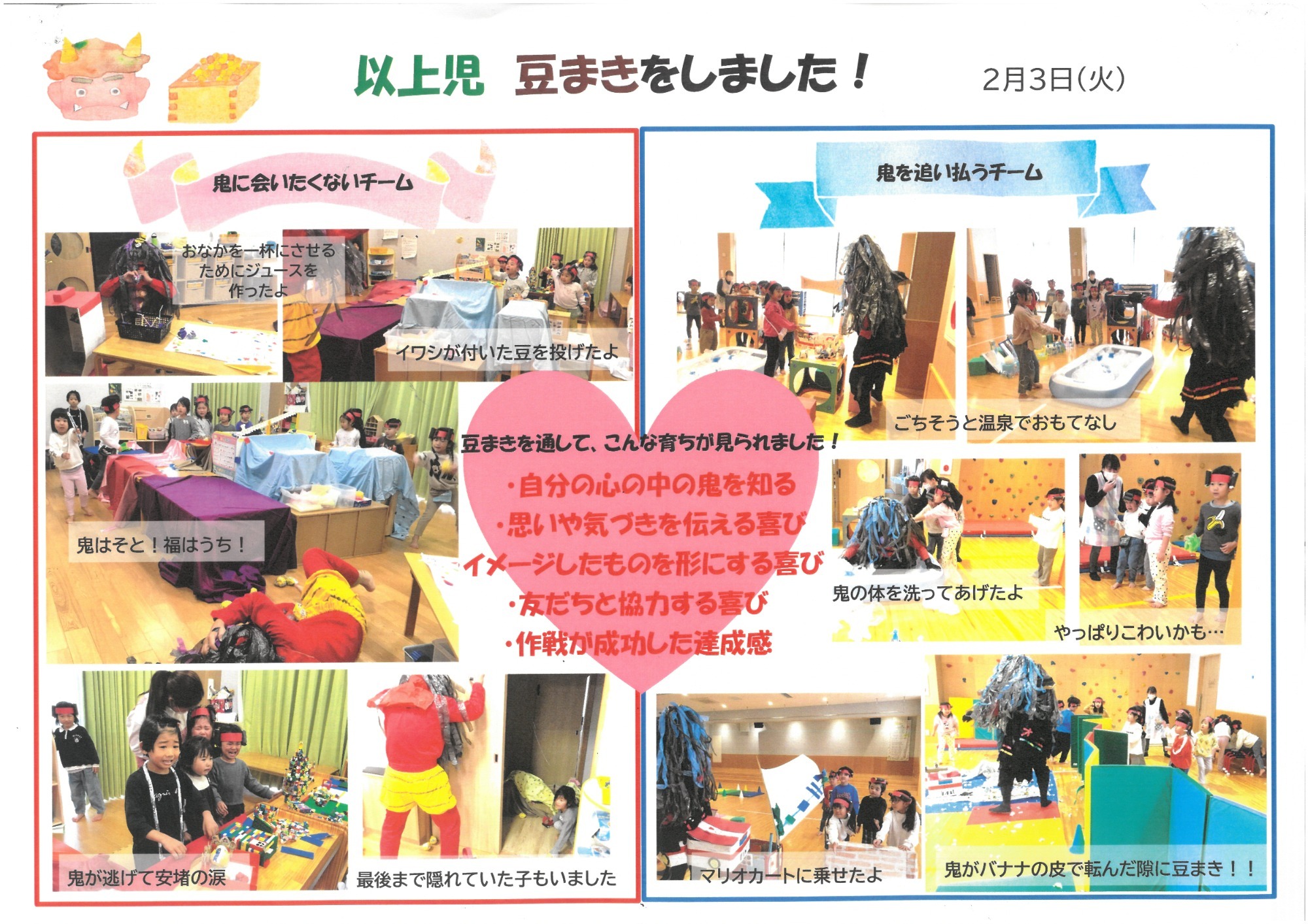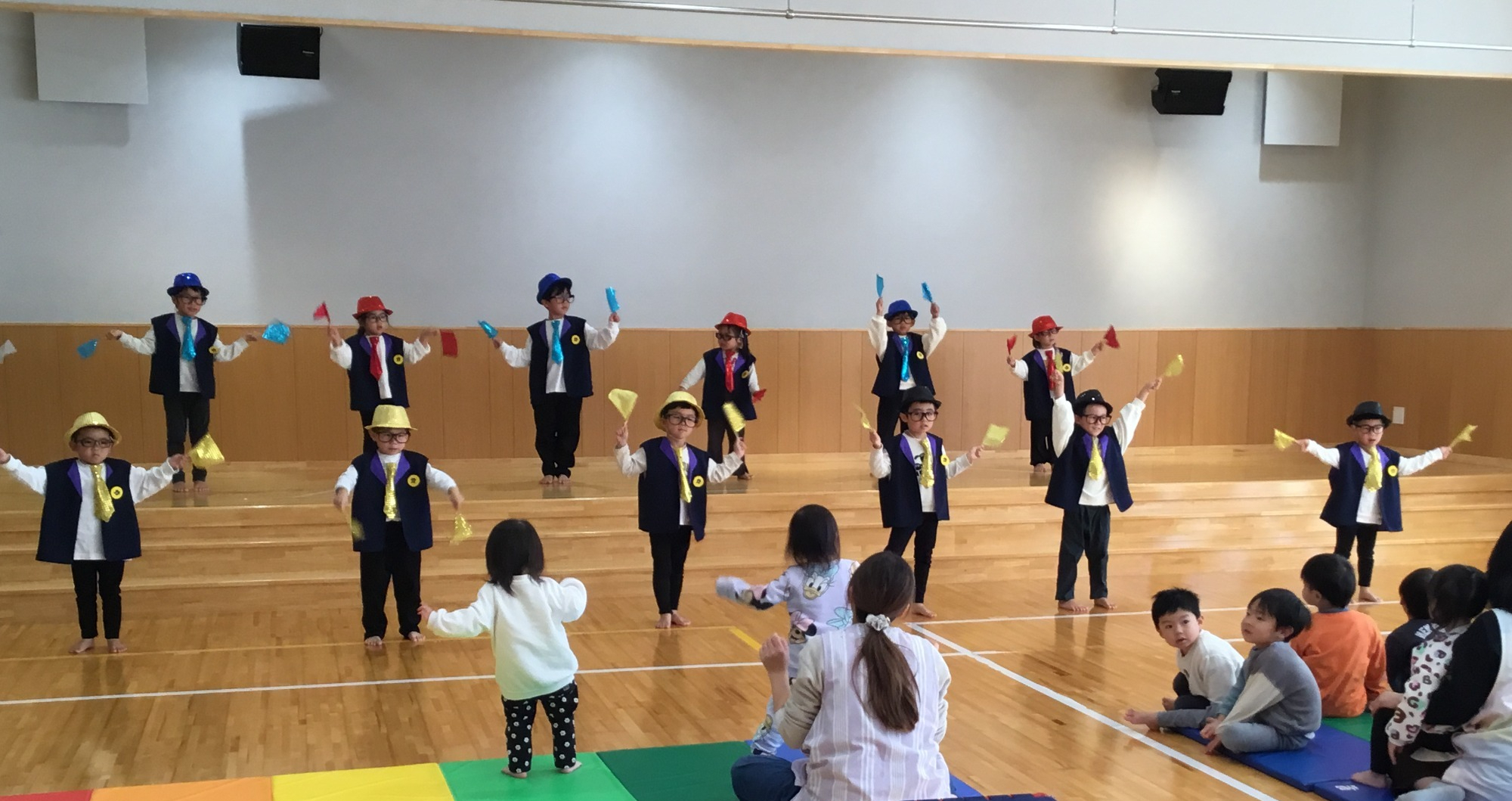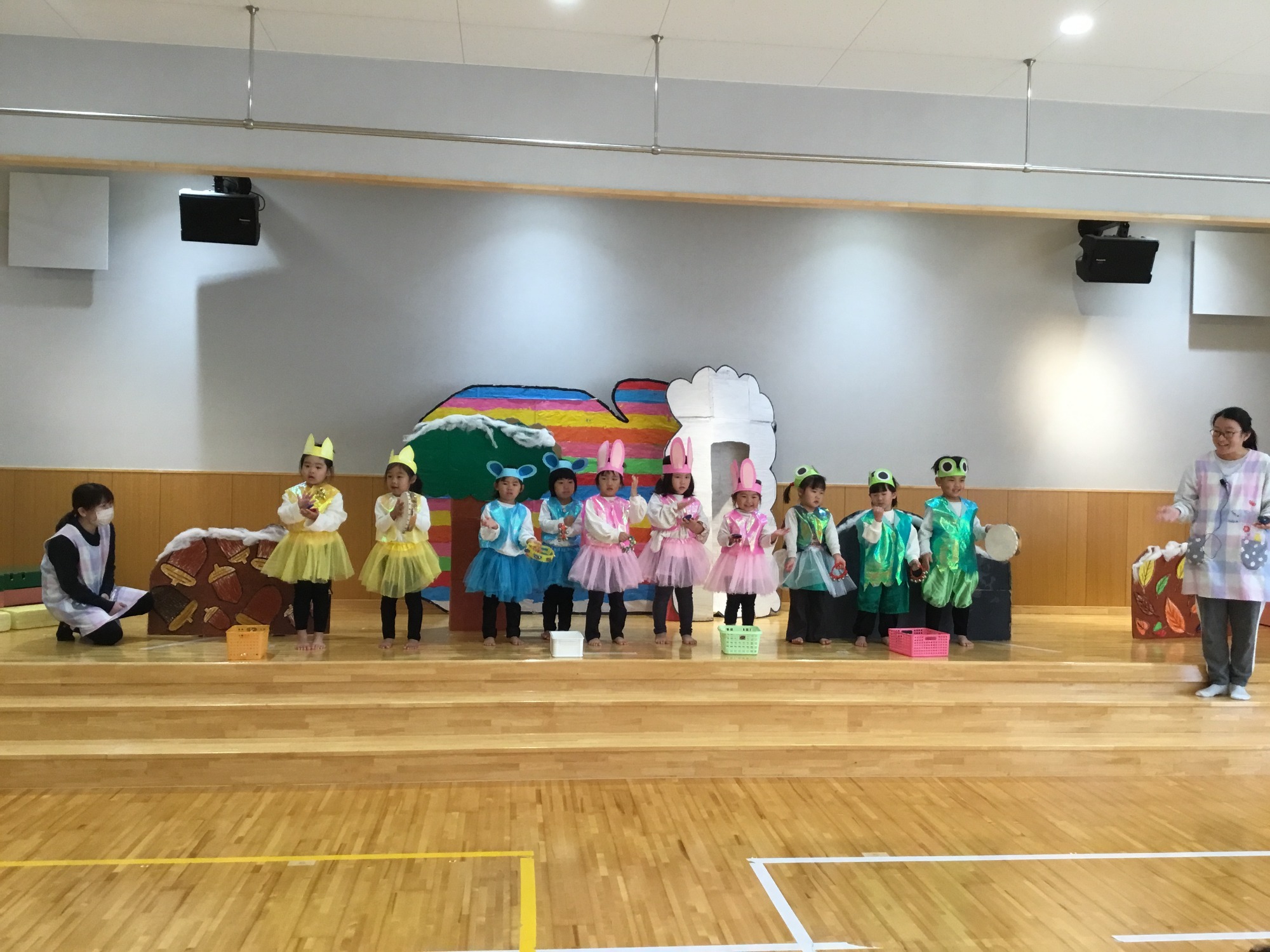R7.4.25 以上児 桜の制作をしました さわやかな風に暖かい日差し。外遊びや散歩が楽しい季節になりました。以上児の子どもたちは今月、近くの加須加美神社へ散歩に行ったりバスでいしかわ子ども交流センターへ行ったりし、満開の桜を見てきましたよ。 桜の花びらをじっくりと観察し、「見て!花びらハートの形や!」「ピンク色かわいい」など桜の特徴を発見していました。そこで、子どもたちの経験をもとにピンク色の絵の具がついたタンポをポンポンと押す桜の制作をしてみました。 「ハートの形できた」と喜ぶ子、何回もポンポンと押し満開の桜を表現する子、「見て~。花びらが下に落ちたよ!」とストーリーを作り出す子。どの子も楽しそうに活動していましたよ。来月もたくさんの自然を見に、園外活動を取り入れていきたいです♪ R7. 3 .13 お別れ会 13名の5歳児あおぞらの子どもたちが、今月22日(土)に卒園式を迎えます。 本日、4歳児たいようの子どもたちがお別れ会を企画してくれて、全児が参加しました。 まず、たいようさんがあおぞらさんにインタビュー。「給食で好きなたべものは?」や「小学校で頑張りたいことは?」とマイクをむけられるとあおぞらさんは「コンソメスー プ」や「こくご」「さんすう」などと、ひとりずつしっかり答えていました。 あおぞらさんと小さいお部屋の子どもたち(未満児組)がペアになって、ふれあい遊びやゲームを楽しみました。だいちさんは、転がしドッチボールを3.4.5歳児で楽しみまし た。また、たいようさんの企画のひとつで男性職員2名の応援団より、「小学校へ行ってしっかりがんばってください!」と激励もいただき子どもたちは大喜びでした。 さいごに大好きな「よさこい 」や「ダンスホール」をあおぞら、たいよう、だいち、未満児さんや職員みんなで踊りました。 たいようの子どもたちがあおぞらさんに内緒で作ったプレゼントも一人ずつ渡して、こどもたちみんなにとってほっこりと楽しいひとときをすごしました。 たいようさんは、緊張しながらもとってもよく頑張りました! ありがとう♡