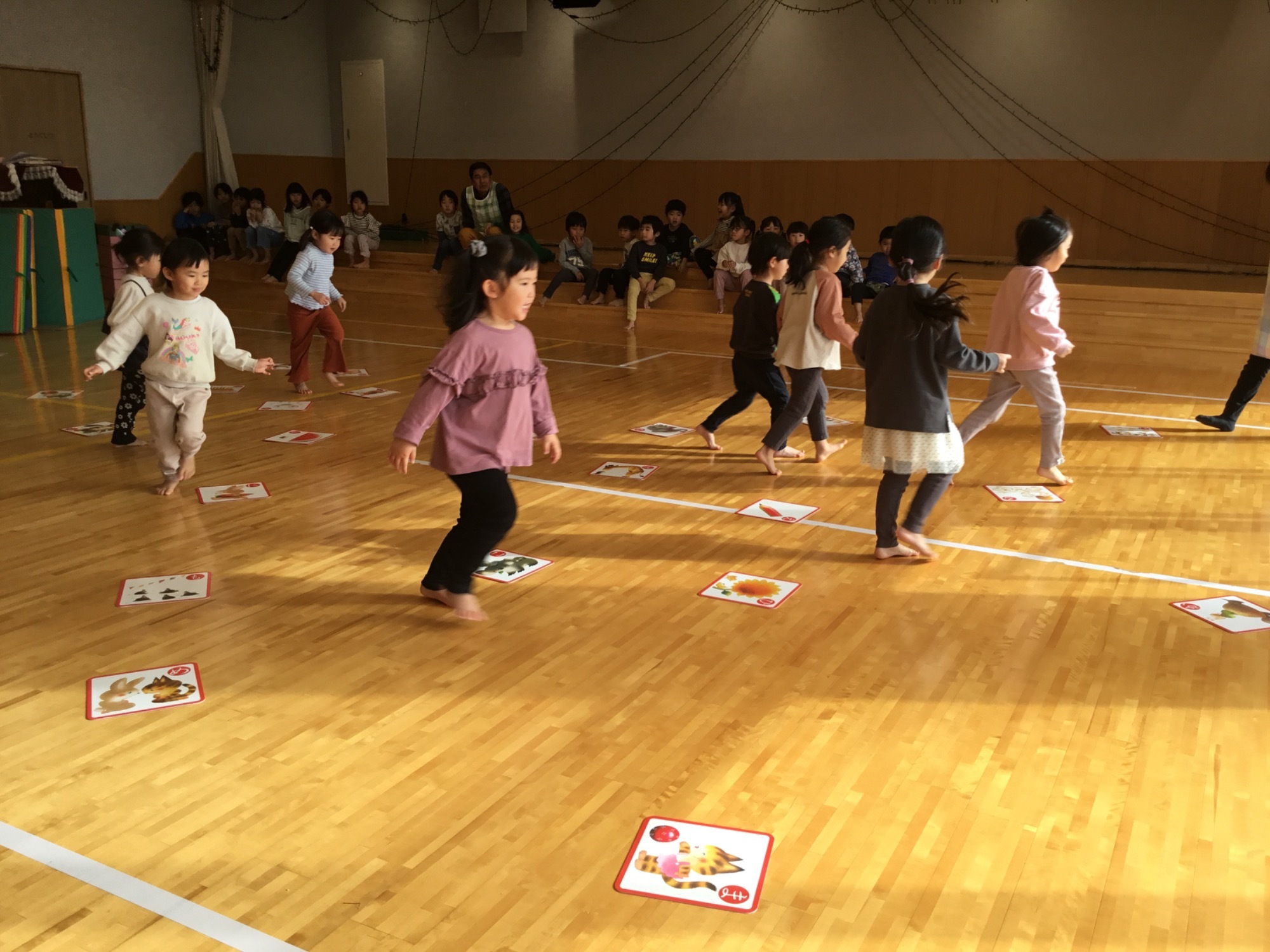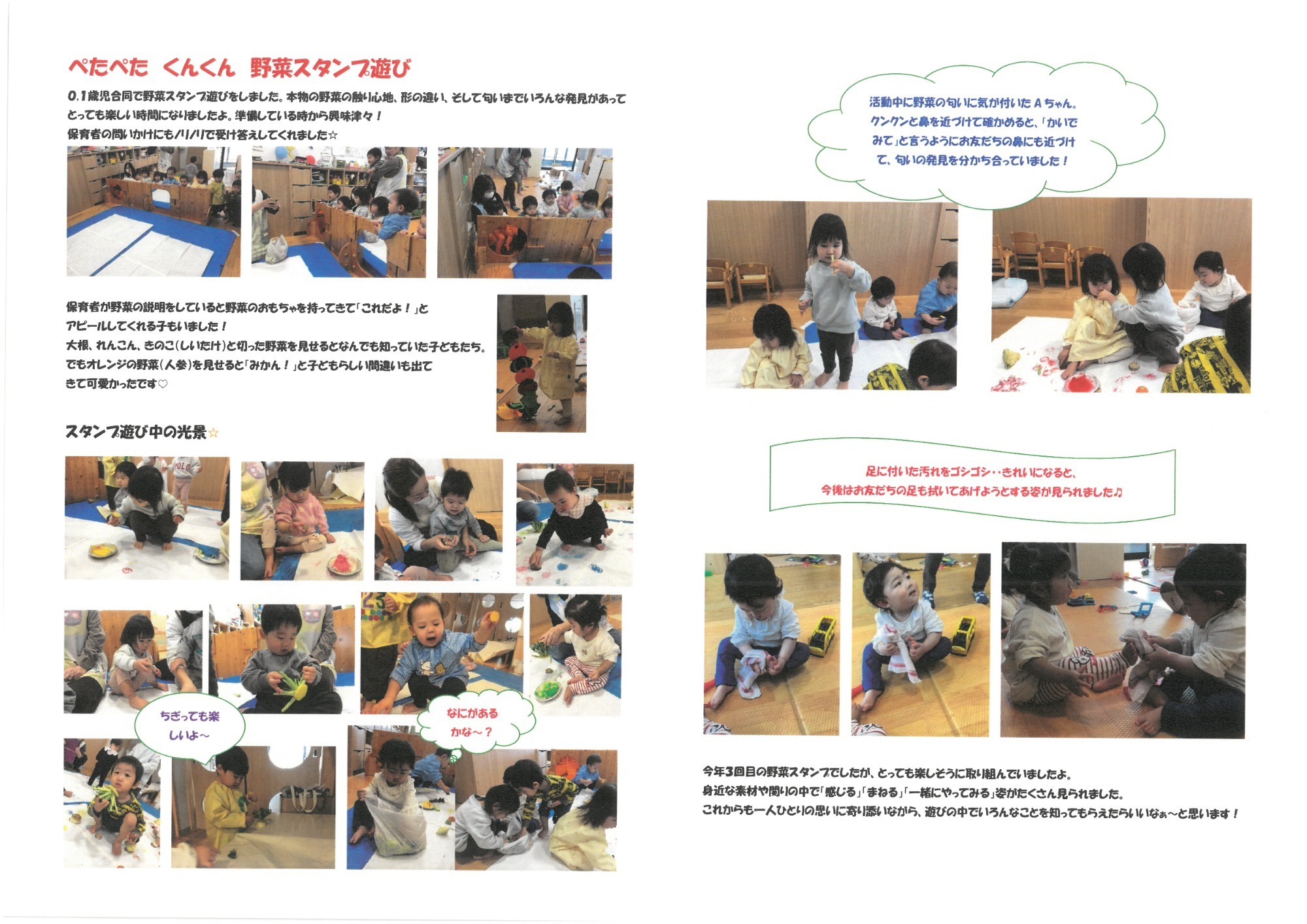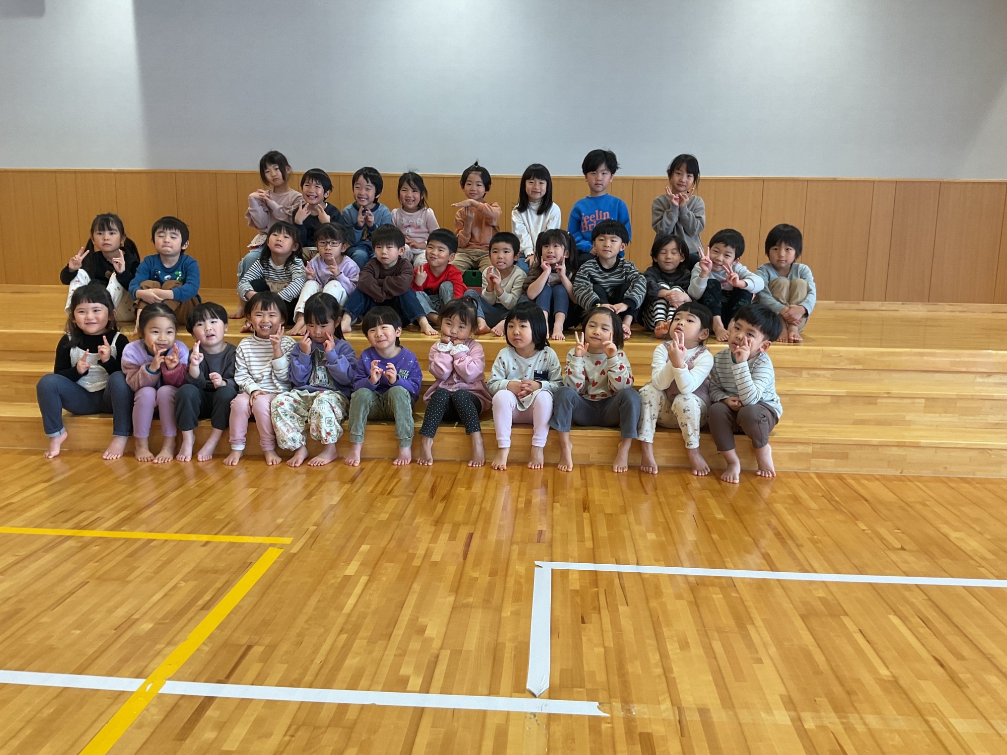 R7.4.25 以上児 桜の制作をしました さわやかな風に暖かい日差し。外遊びや散歩が楽しい季節になりました。以上児の子どもたちは今月、近くの加須加美神社へ散歩に行ったりバスでいしかわ子ども交流センターへ行ったりし、満開の桜を見てきましたよ。 桜の花びらをじっくりと観察し、「見て!花びらハートの形や!」「ピンク色かわいい」など桜の特徴を発見していました。そこで、子どもたちの経験をもとにピンク色の絵の具がついたタンポをポンポンと押す桜の制作をしてみました。 「ハートの形できた」と喜ぶ子、何回もポンポンと押し満開の桜を表現する子、「見て~。花びらが下に落ちたよ!」とストーリーを作り出す子。どの子も楽しそうに活動していましたよ。来月もたくさんの自然を見に、園外活動を取り入れていきたいです♪ R7. 3 .13 お別れ会 13名の5歳児あおぞらの子どもたちが、今月22日(土)に卒園式を迎えます。 本日、4歳児たいようの子どもたちがお別れ会を企画してくれて、全児が参加しました。 まず、たいようさんがあおぞらさんにインタビュー。「給食で好きなたべものは?」や「小学校で頑張りたいことは?」とマイクをむけられるとあおぞらさんは「コンソメスー プ」や「こくご」「さんすう」などと、ひとりずつしっかり答えていました。 あおぞらさんと小さいお部屋の子どもたち(未満児組)がペアになって、ふれあい遊びやゲームを楽しみました。だいちさんは、転がしドッチボールを3.4.5歳児で楽しみまし た。また、たいようさんの企画のひとつで男性職員2名の応援団より、「小学校へ行ってしっかりがんばってください!」と激励もいただき子どもたちは大喜びでした。 さいごに大好きな「よさこい 」や「ダンスホール」をあおぞら、たいよう、だいち、未満児さんや職員みんなで踊りました。 たいようの子どもたちがあおぞらさんに内緒で作ったプレゼントも一人ずつ渡して、こどもたちみんなにとってほっこりと楽しいひとときをすごしました。 たいようさんは、緊張しながらもとってもよく頑張りました! ありがとう♡