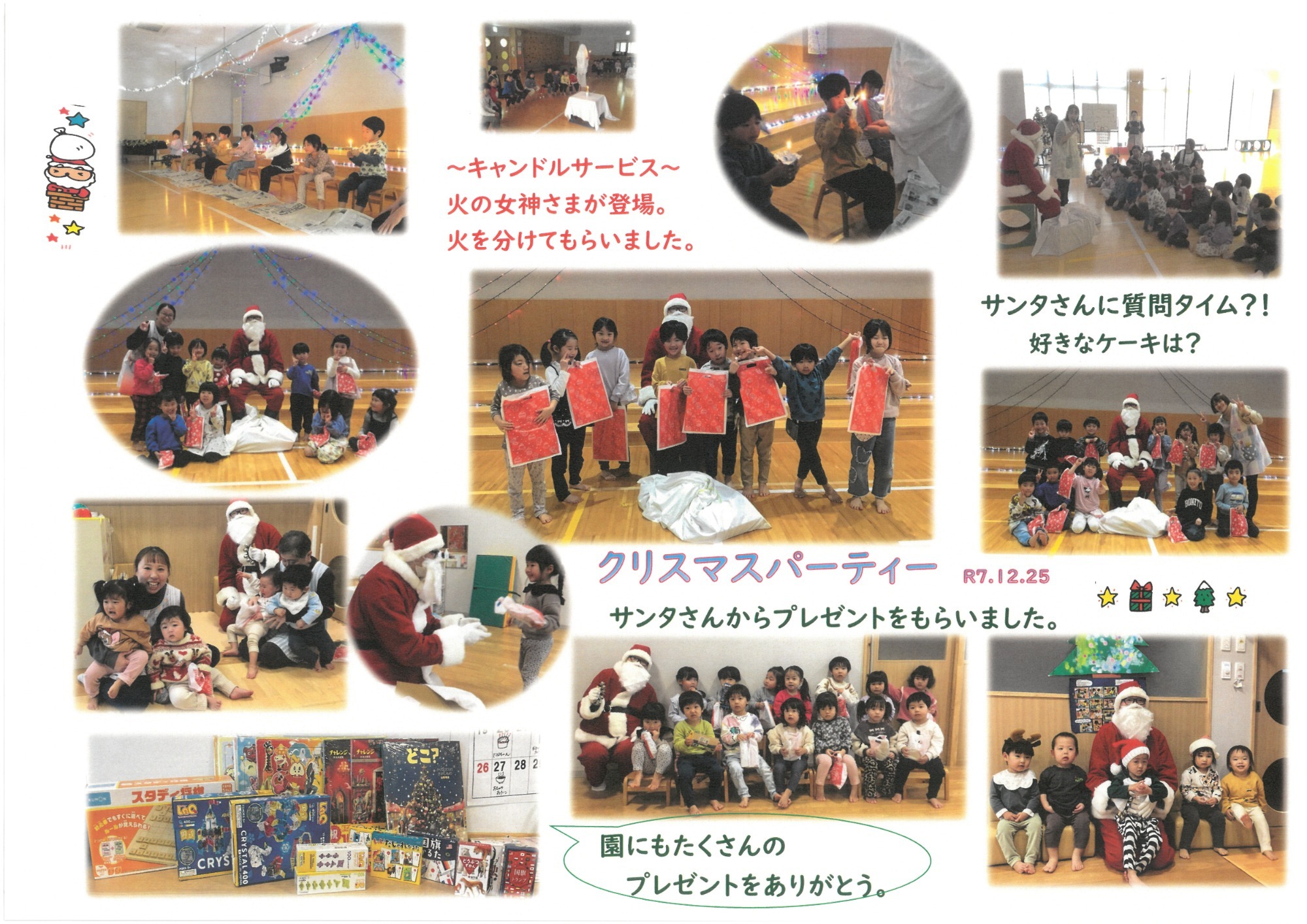 令和7年 12月の予定 5日(金) 布団持ち帰り 6日(土) 以上児:表現会 9日(火) あおぞら:お茶のおけいこ 途中入園児説明会13:20~ 11日(木) 以上児:バス園外 たんぽぽさんのおへや 15日(月) 身体測定週間 16日(火) 以上児:木育活動9:40~ 18日(木) あおぞら:かきかた教室 たんぽぽさんのおへや 19日(金) 食育の日・から弁の日 そよかぜ:園外保育 布団持ち帰り 24日(水) クリスマスケーキ作り(以上児) 25日(木) クリスマスパーティー 26日(金) 鏡餅・まゆ玉づくり 持ち帰り【布団・ズック・着替え等】 |