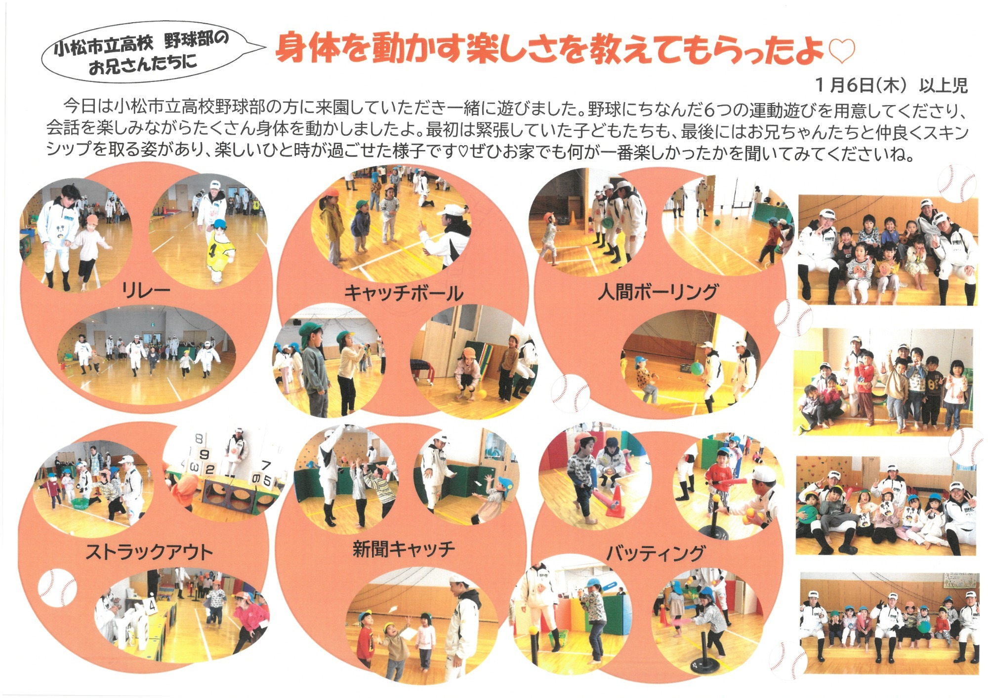 令和8年 1月の予定 6日(火) 以上児:小松市立高校野球部来園 8日(木) あおぞら:体育あそび たんぽぽさんのおへや 9日(金) 鏡開き にこにこパーティー 15日(木) たんぽぽさんのおへや 16日(金) 布団持ち帰り 17日(土) 未満児:保育参加と懇談会 19日(月) たんぽぽさんのおへや 22日(木) あおぞら:かきかた教室 たいよう・だいち:園外保育 26日(月) たんぽぽさんのおへや 27日(火) あおぞら:お茶のおけいこ 29日(木) たんぽぽさんのおへや